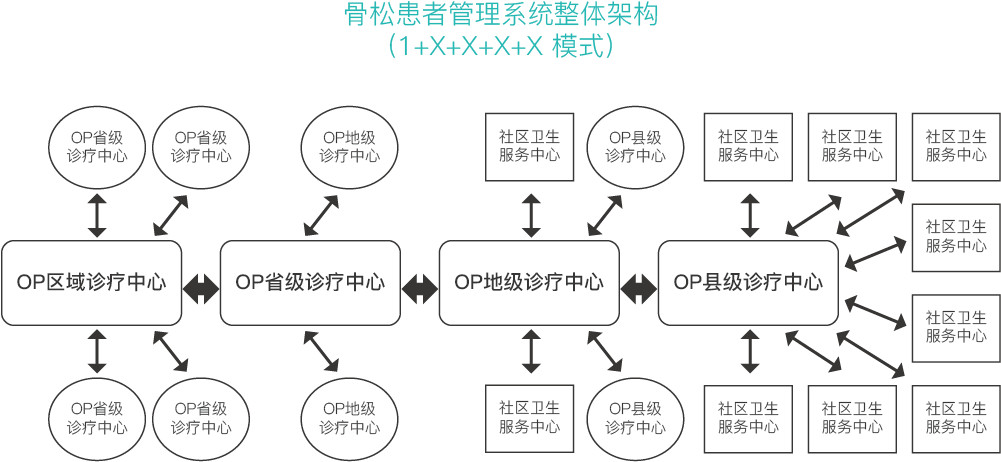 建立骨質疏松標準化診療技術和流程,開創骨質疏松患者管理新模式 建立遍布全國基層醫療機構骨質疏松特色專科,培養遍布全國基層醫療機構骨質疏松患者診療隊伍。最終形成全國總中心 -區域診療中心 -地市級診療中心 -縣級診療中心 -社區中心五級防控網絡。